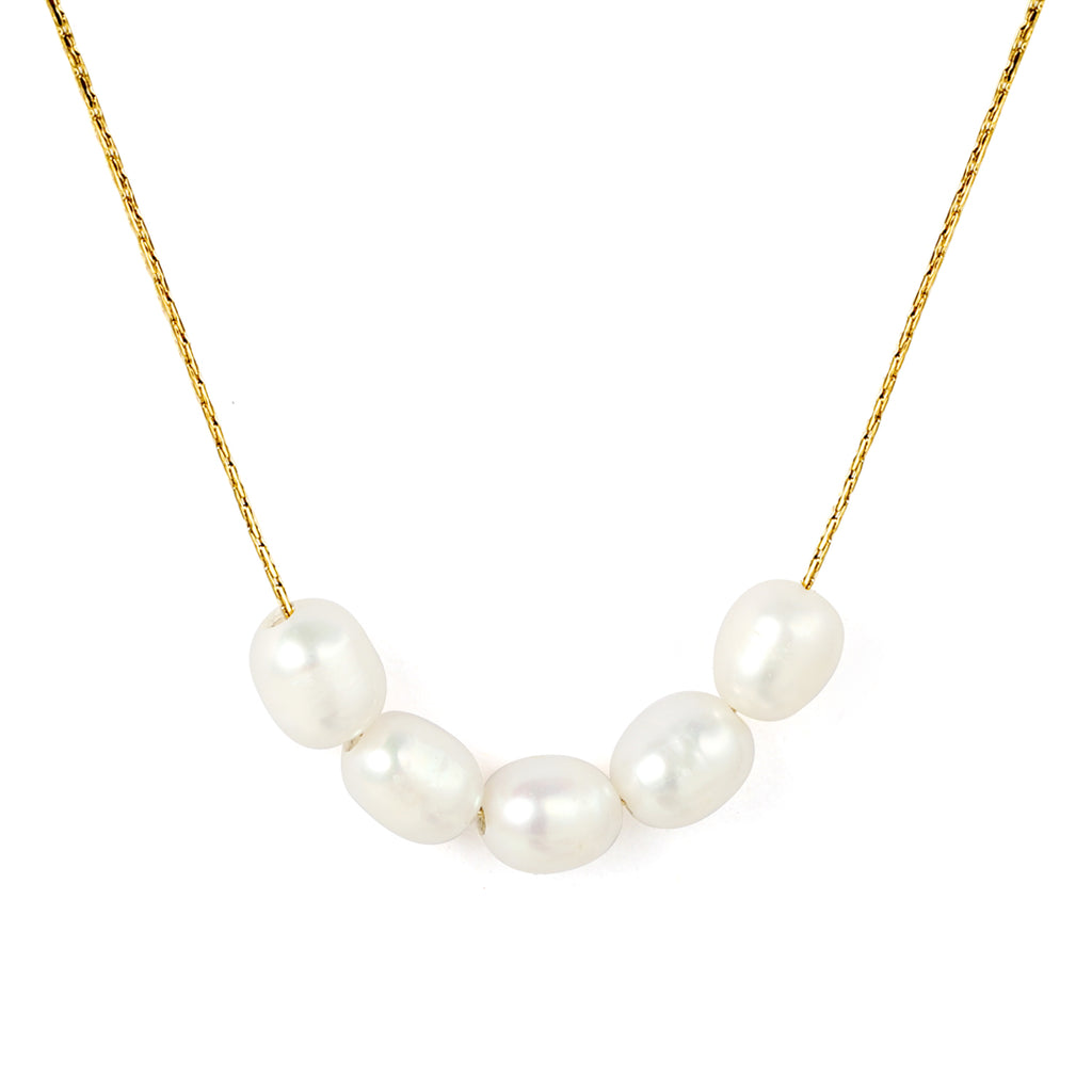 This gold necklace features five 6x7mm freshwater pearls paired with a 0.3 cross hammer round chain, adjustable from 40 to 45cm. Completed with a 6mm round pendant, it showcases expert craftsmanship and a refined design, perfect for adding subtle elegance to any ensemble.