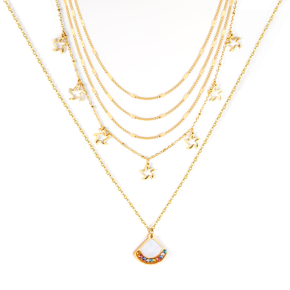 As an expert in fine jewelry, we bring you this stunning fan and star pendant with mixed diamonds. The intricate design is complemented by five delicate chains, ranging from 45 to 5 centimeters. Made with high-quality gold, this necklace is a timeless and elegant addition to any collection.